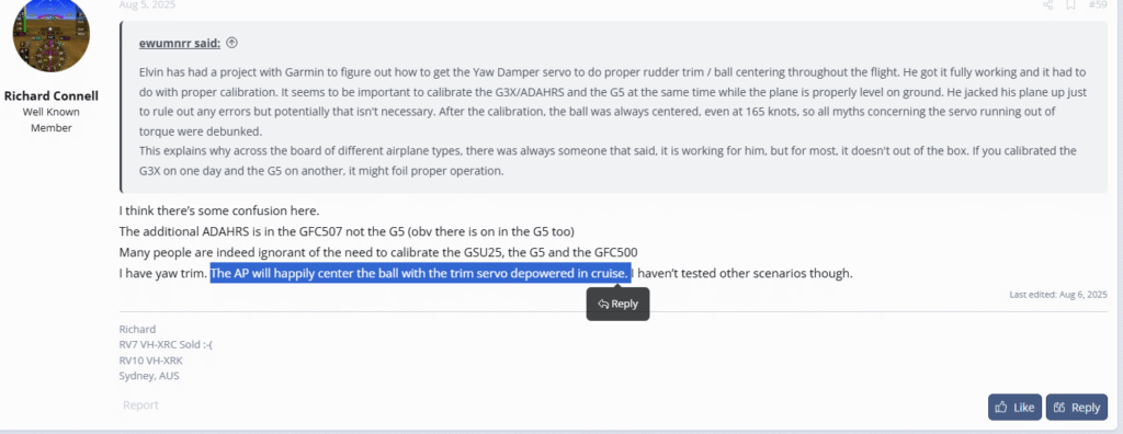 I have been very careful in verbiage while writing the above. I have specifically mentioned the behavior of the Garmin YD because this isn’t necessarily something any other YD will do. Again, the main purpose of YD is to stabilize an airplane which is inherently slightly unstable in yaw. That said, many mechanisms referred to as “yaw damper” also include functionality to try to coordinate. I have seen similar pilot reports suggesting the Dynon YD will also try to center the ball.