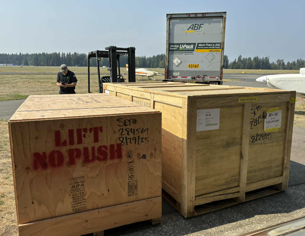 Yesterday was another milestone day. The fuselage arrived! I was busy at work so Ephraim handled receiving the crates.