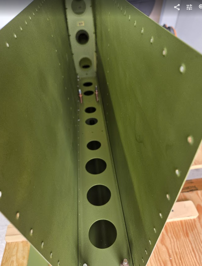 I arrived in the morning to see the Hstab rear spar primed and hanging to dry already! With the green primer on, it looked like a real airplane part.